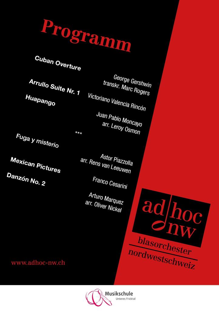 La banda Adhoc Nordwestschweiz se reúne una vez al año para una serie de conciertos con un director invitado. Para la temporada 2020 estaba previsto que la banda y yo colaboráramos en un programa de raíz latino-americana. El grupo está conformado por músicos profesionales, estudiantes y amateurs de alto nivel provenientes de la region noroeste de Suiza. La region noroeste del país está conformada oficialmente por tres cantones, el cantón de Basilea-ciudad, Basilea-campaña y Argovía.